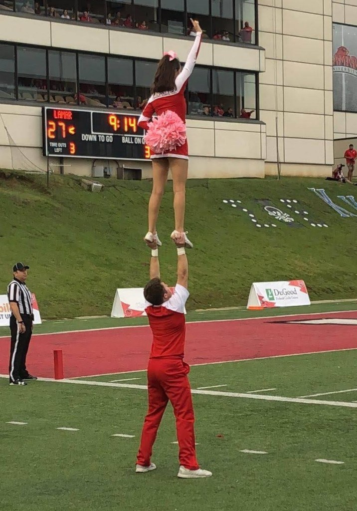 My freshman year at Lamar University I was a member of the University’s cheer squad. With the squad I went to NCA Camp at Southern Methodist University, cheered at football and basketball games and other university events, traveled to football playoffs in Iowa, and spent spring break at the Southland Conference basketball tournament.